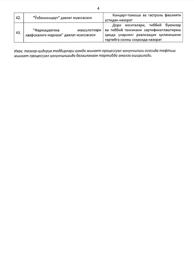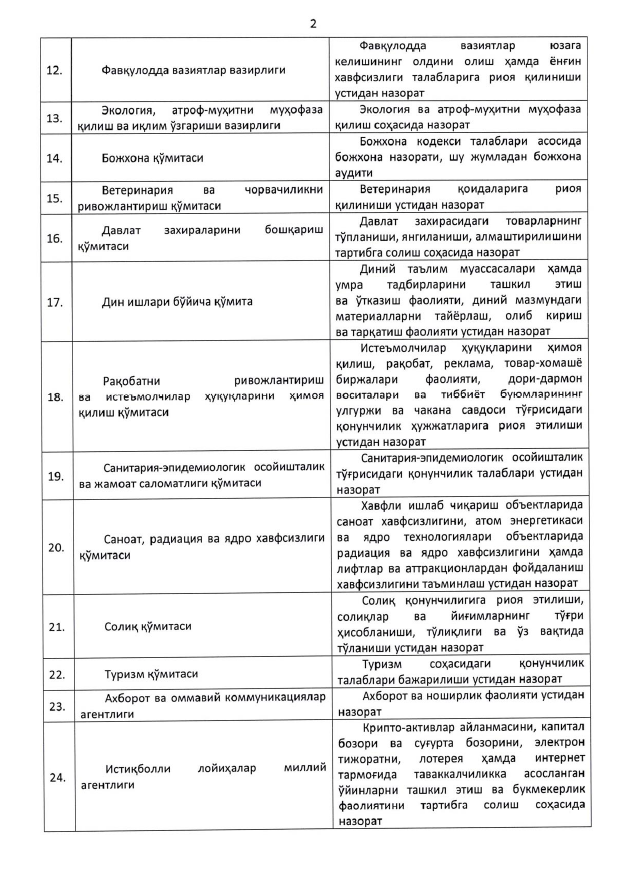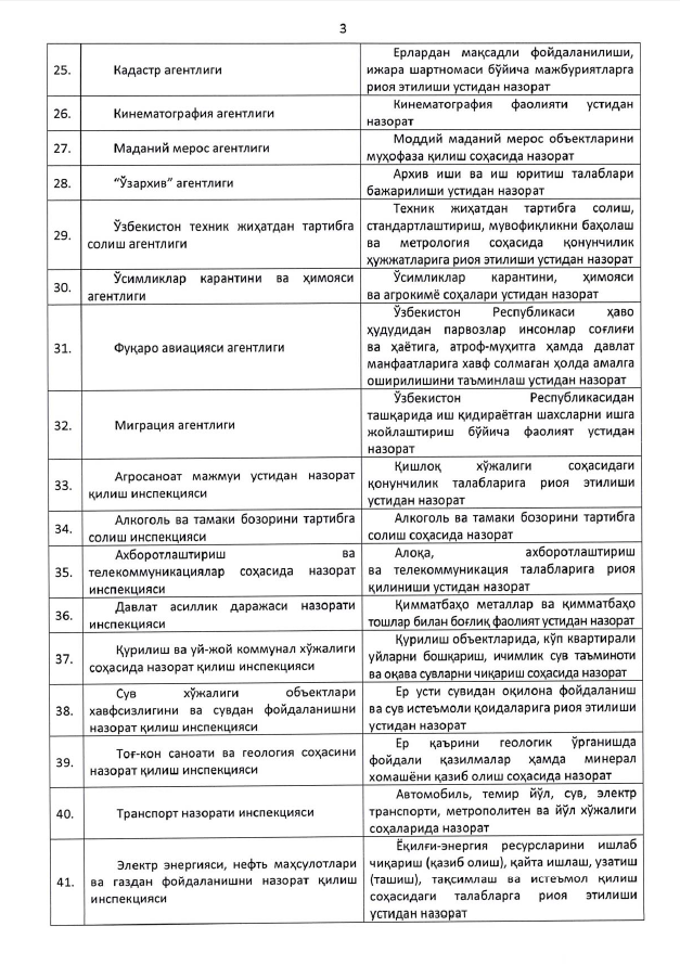 Бунда ушбу рўйхатга киритилмаган органлар ҳамда ташкилотлар томонидан ҳамда назорат соҳасида назарда тутилмаган масалалар бўйича тадбиркорлик субъектлари фаолиятида назорат тартибларини ўтказиш тақиқланади.