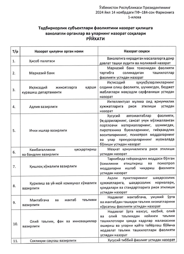 ПФ-184 сонли Президент Фармони билан тадбиркорлик субъектлари фаолиятини назорат қилишга ваколатли органлар ва уларнинг назорат соҳалари рўйхати тасдиқланди.