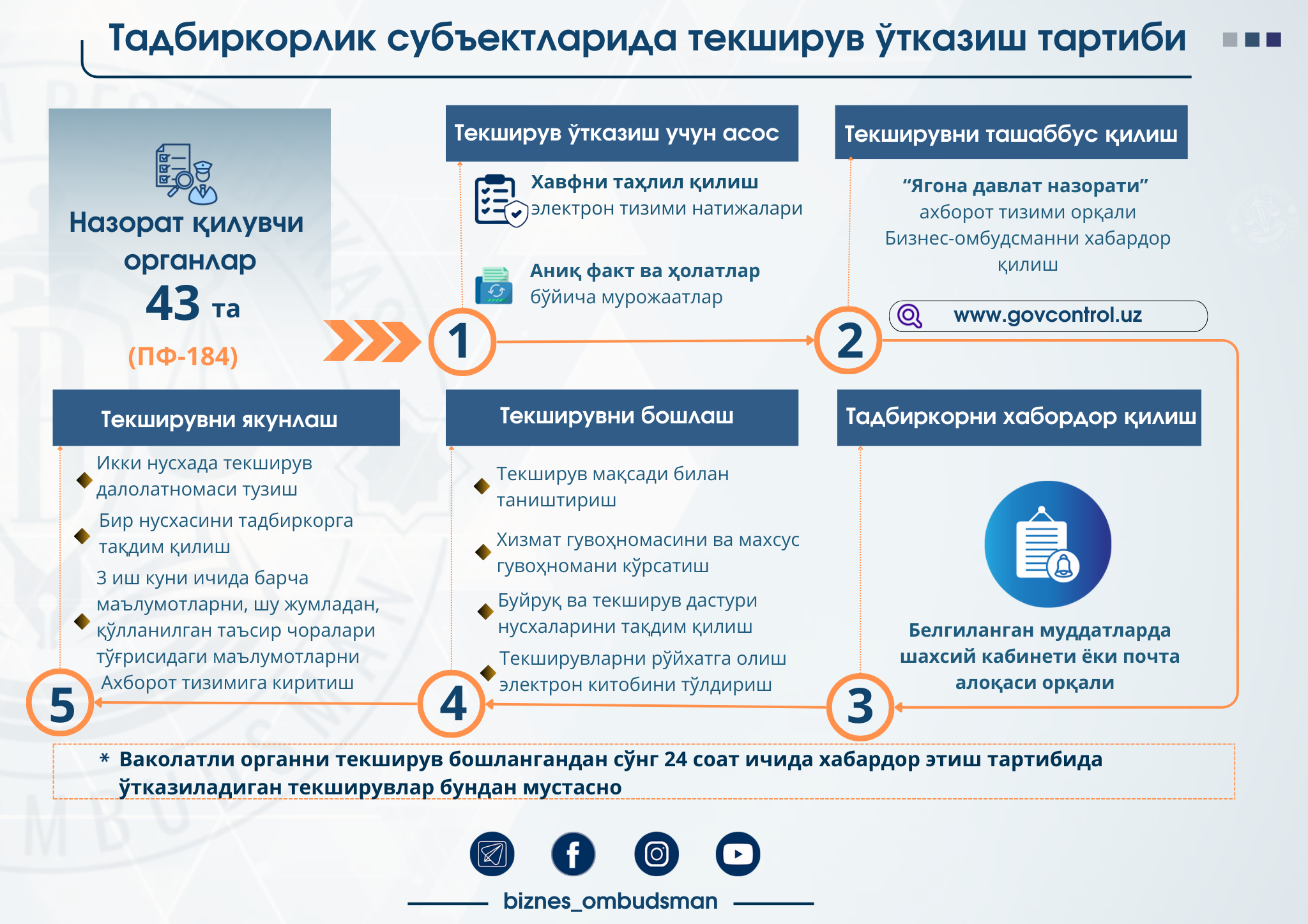 Ушбу инфографика ёрдамида тадбиркорлар фаолиятидаги текширувлар жараёни ҳақида билиб олинг ва ҳуқуқларингизни ҳимоя қилинг!