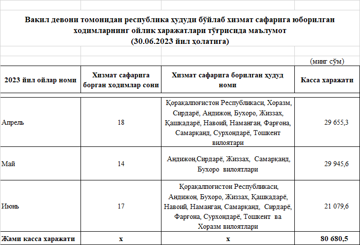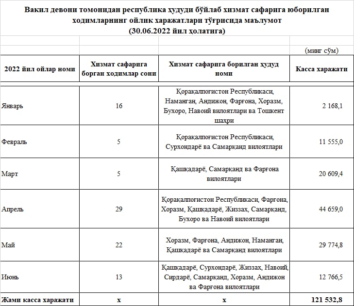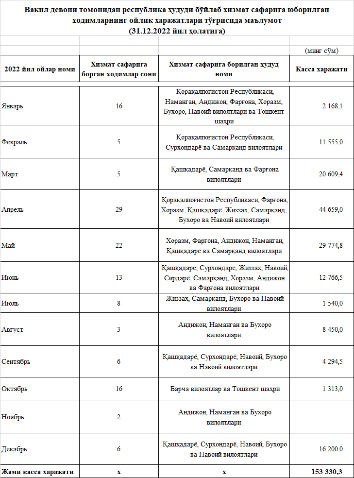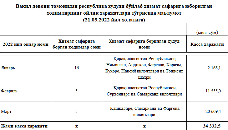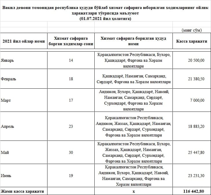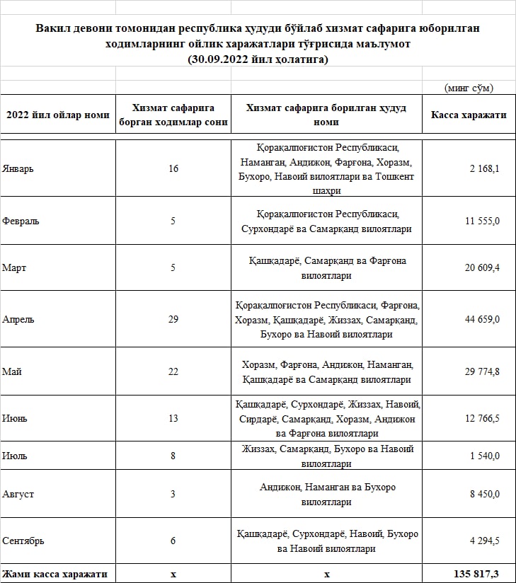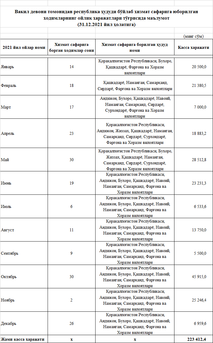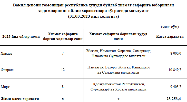 Сведения о ежемесячных расходах сотрудников, направляемых Аппаратом Уполномоченного в командировку по территории республики