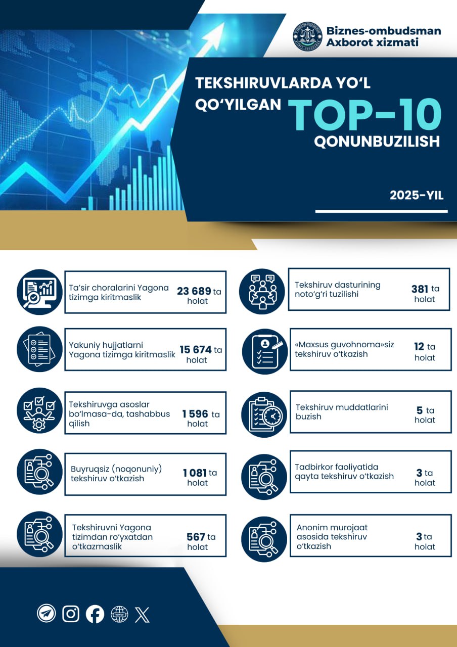 2025-yil davomida 1 072 nafar mansabdor shaxs tekshiruv o‘tkazish tartibini buzgani uchun ma’muriy javobgarlikka tortildi.