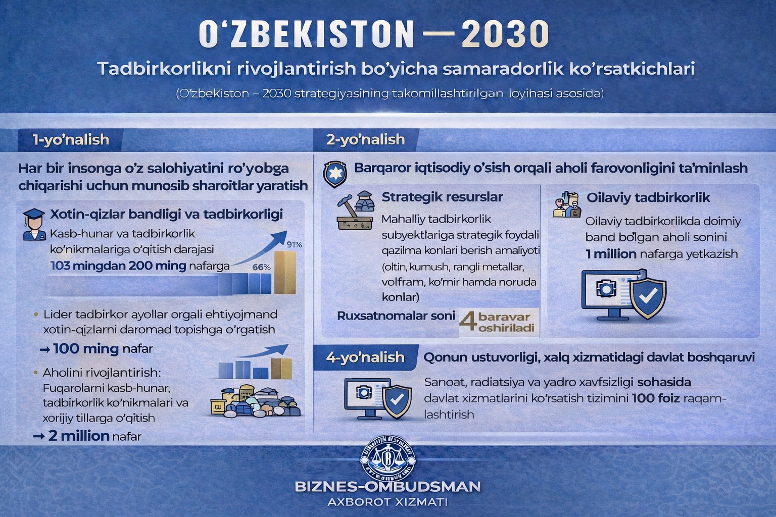 “O‘zbekiston – 2030” strategiyasining takomillashtirilgan loyihasida biznes muhitini yaxshilash va tadbirkorlarni qo‘llab-quvvatlash bo‘yicha muhim samaradorlik ko‘rsatkichlari belgilanadi.