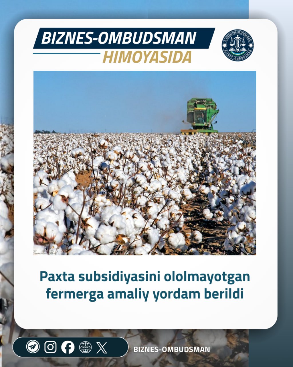 Qashqadaryo viloyati Qamashi tumanida faoliyat ko‘rsatayotgan “Sh” fermer xo‘jaligi rahbari yetishtirgan paxta mahsuloti uchun subsidiya puli to‘lab berilmayotganidan norozi bo‘lib Biznes-ombudsmanga murojaat qildi.