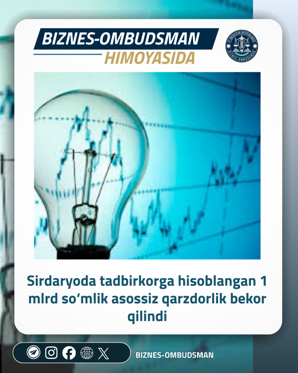 Sirdaryo viloyatidagi “R.A.” MChJ rahbari Biznes-ombudsmanga murojaat qilib, korxonaga elektr energiyasidan 1,1 mlrd so‘m miqdorida asossiz qarzdorlik hisoblanganidan noroziligini bildirdi.