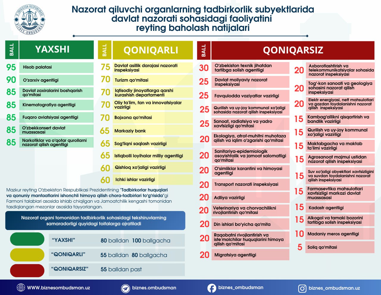 Mazkur reyting O‘zbekiston Respublikasi Prezidentining PF-184-son Farmoni talablari asosida ishlab chiqilgan va Tadbirkorlikni qo‘llab-quvvatlash jamoatchilik kengashi tomonidan tasdiqlangan mezonlar (https://t.me/biznes_ombudsman/10664) asosida shakllantirildi.