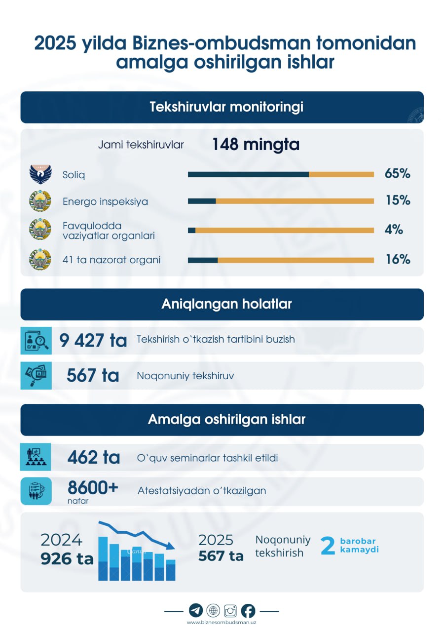 2025-yilda tadbirkorlik faoliyatiga noqonuniy aralashishga chek qo‘yish bo‘yicha ko‘rilgan tizimli choralar natijasida asossiz tekshiruvlar soni sezilarli darajada kamayishiga erishildi.