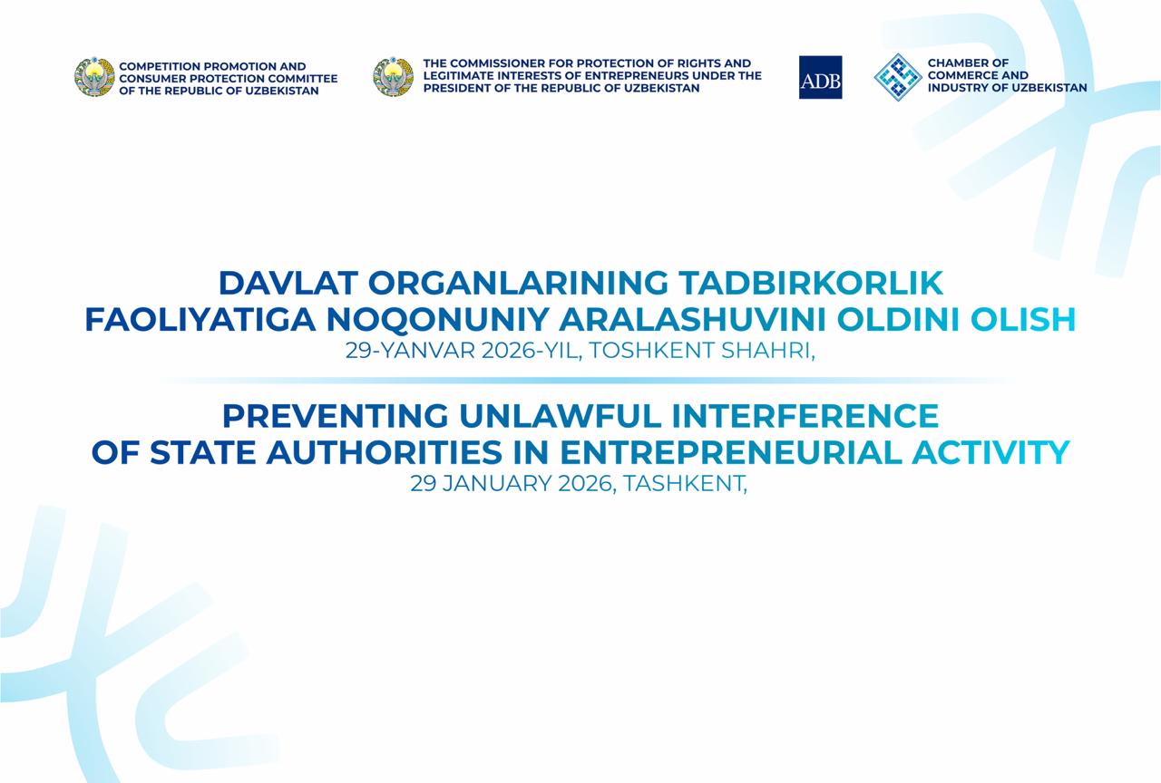 Bugun, 29-yanvar kuni Toshkentda Raqobatni rivojlantirish va iste’molchilar huquqlarini himoya qilish qo‘mitasi, Biznes-ombudsman hamda Savdo-sanoat palatasi hamkorligida “Davlat organlarining tadbirkorlik faoliyatiga noqonuniy aralashuvini oldini olish” mavzusida xalqaro konferensiya o‘z ishini boshladi.