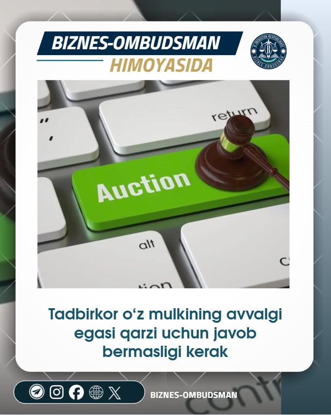 Vazirlar Mahkamasining 18-sonli qaroriga ko‘ra, auksionda sotilgan mulk g‘olibga qarzlarsiz va taqiqlardan yechilgan holda topshirilishi belgilangan.