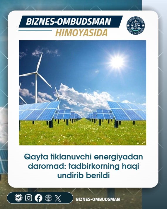 Samarqand viloyatida faoliyat ko‘rsatayotgan “A.Y.Q.” MChJ rahbari Biznes-ombudsmanga murojaat qilib, qayta tiklanuvchi energiya manbalari orqali ishlab chiqarilgan va yagona elektr energetika tizimiga uzatilgan elektr energiyasi uchun to‘lovlarni undirishda amaliy yordam so‘radi.