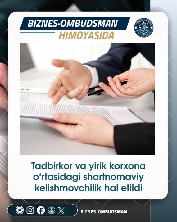 Tadbirkor va yirik korxona o‘rtasidagi shartnomaviy kelishmovchilik hal etildi