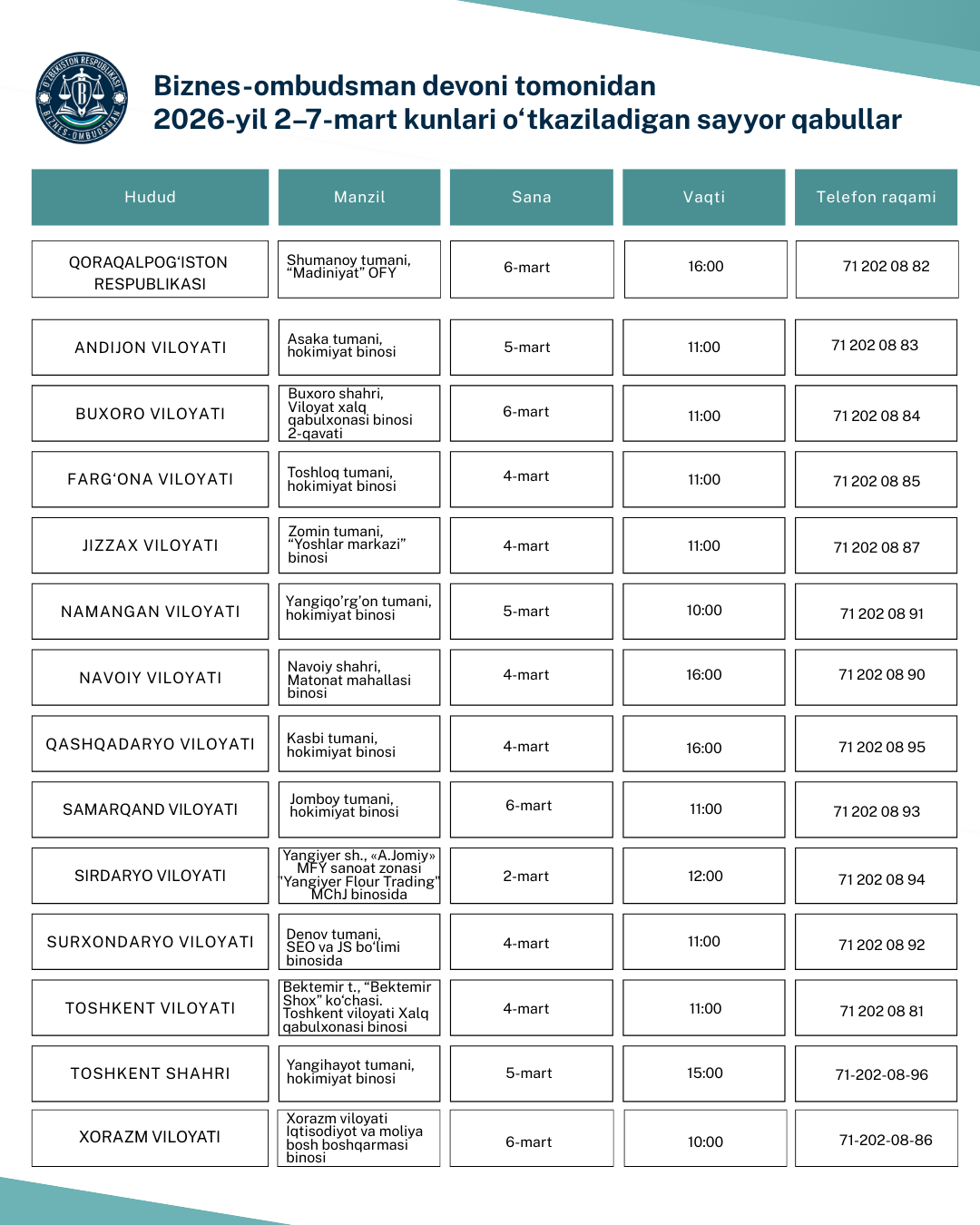 2026-yil 2-7-mart kunlari yurtimiz bo‘ylab Biznes-ombudsman devoni tomonidan sayyor qabullar tashkil etiladi.