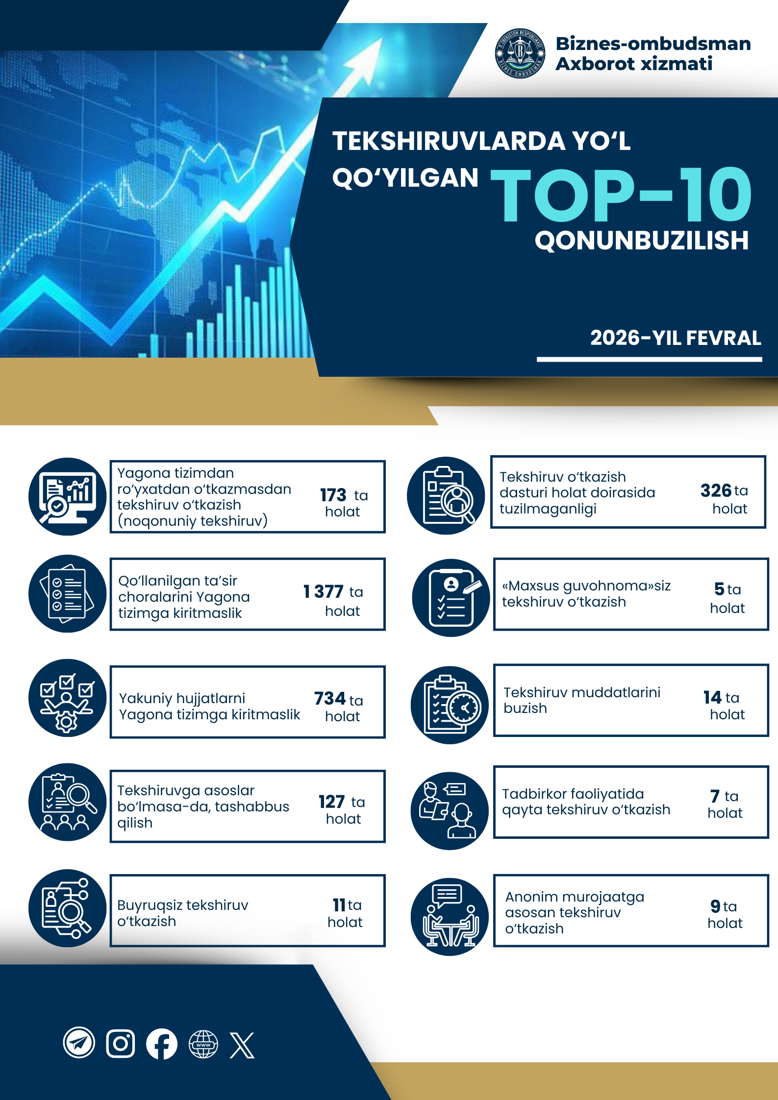 2026-yilning fevral oyi davomida nazorat qiluvchi organlar tomonidan tadbirkorlik subyektlari faoliyatini tekshirishda qonunbuzilish holatlari tahlil qilinganda eng ko‘p Yagona tizimdan ro‘yxatdan o‘tkazmasdan tekshiruv o‘tkazishga yo‘l qo‘yilganligi aniqlandi.