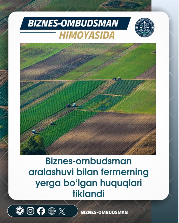 Biznes-ombudsman nazorati ostida o‘tkazilgan o‘rganishlardan so‘ng, joriy yilning 10-mart kuni vakolatli tashkilotlar tomonidan barcha hujjatlar rasmiylashtirildi. Natijada, 22,97 gektar yer maydoniga bo‘lgan huquqlar fermer xo‘jaligi nomiga davlat ro‘yxatidan o‘tkazilishi ta’minlandi.