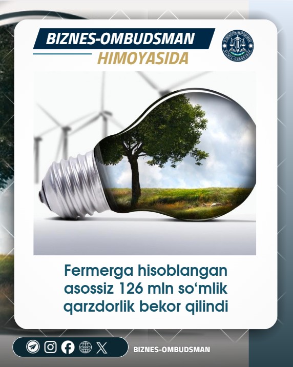 Biznes-ombudsman tomonidan kiritilgan xulosa natijasida asossiz hisoblangan 126 mln so‘mga yaqin qarzdorlik tizimdan o‘chirilib, fermerning murojaati ijobiy hal etildi.