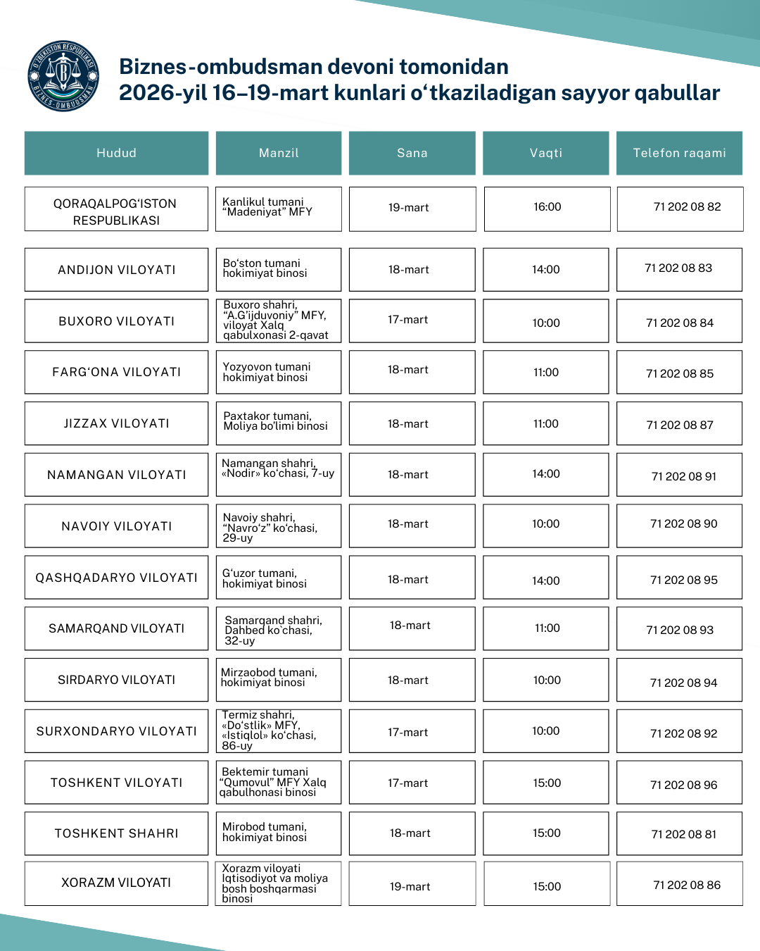 2026-yil 16-19-mart kunlari yurtimiz bo‘ylab Biznes-ombudsman devoni tomonidan sayyor qabullar tashkil etiladi.