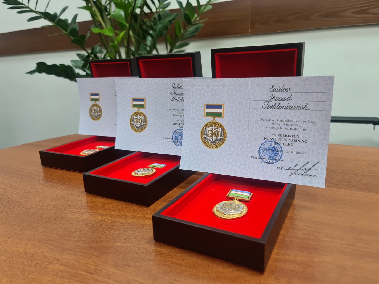 7 ноябрь куни «Ўзбекистон Конституциясининг 30 йиллиги» эсдалик нишони билан мамлакатимиз мустақиллигини мустаҳкамлаш, унинг иқтисодий, сиёсий, ижтимоий, илмий, маънавий салоҳиятини юксалтириш, мудофаа қудратини оширишга муносиб ҳисса қўшиб келаётган юртдошларимиз тақдирландилар.